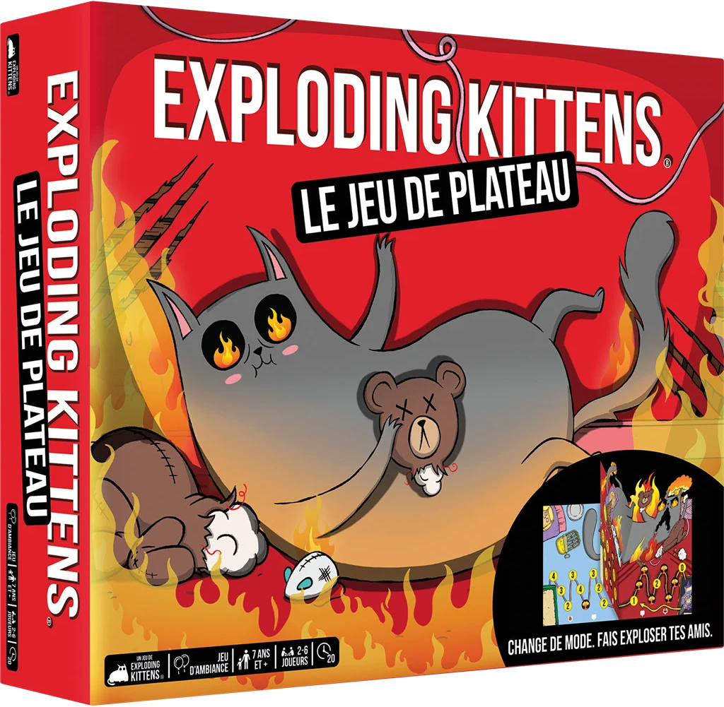 L’univers d’Exploding Kittens, un grand classique des party games, s’enrichit d’une version jeu de société. « Exploding Kittens – le jeu de plateau » vous propose une aventure explosive et déjantée dans laquelle vous courez, sautez, tournez et sabotez jusqu’à épuisement (ou jusqu’à ce que vous explosiez à la manière d’une roulette russe, naturellement). La combinaison d’un plateau 3D coloré, de règles simples et d’éléments tactiques rend chaque tour passionnant. Choisissez votre personnage, saisissez vos cartes action et essayez d’être le premier à atteindre la ligne d’arrivée. Facile, non ? En fait, heu ... pas vraiment.