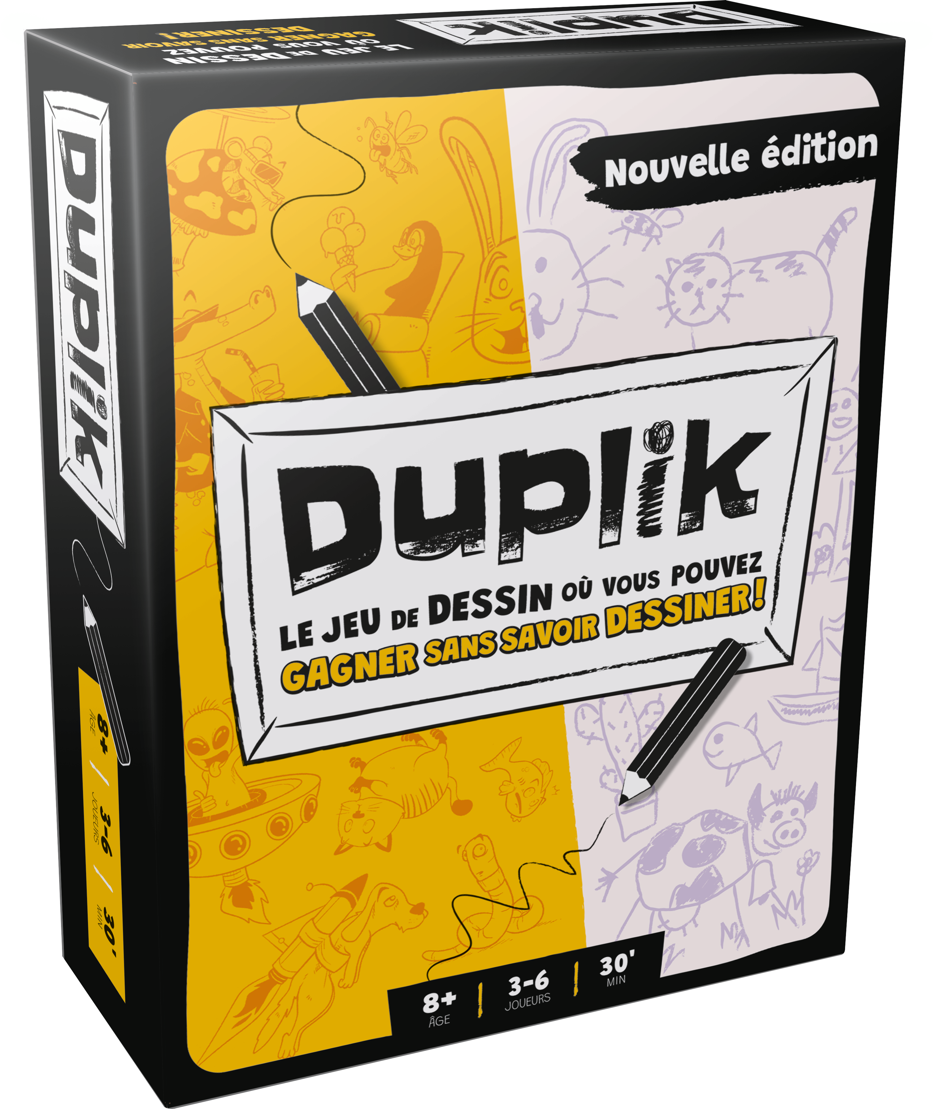 « Duplik » est un jeu de dessin que vous pourrez remporter sans savoir dessiner !? Votre dessin ne doit pas nécessairement être beau, tant qu’il contient les détails corrects. Un joueur décrit un dessin drôle ou farfelu, les autres essaient de le reproduire le mieux possible en 90 secondes sans voir le dessin. Les points sont ensuite attribués sur la base de critères secrets. Plus vous écoutez et plus vous retenez les détails, plus vous récolterez des points.